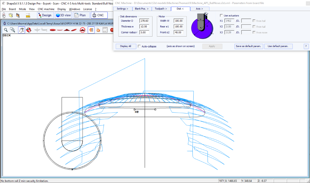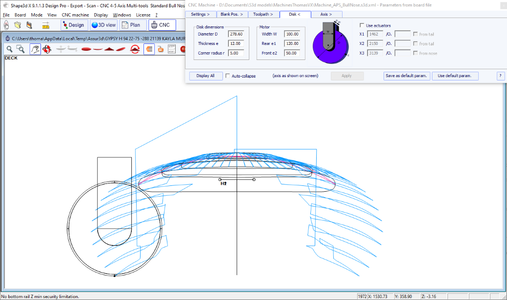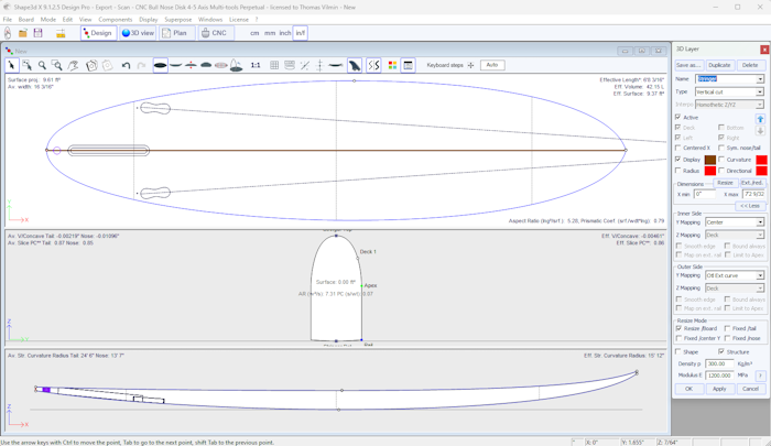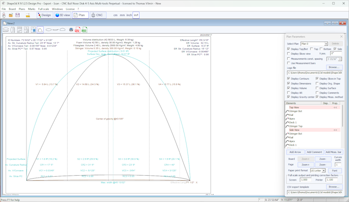 Note that it is also possible to print the developed surface in full scale, or as a multi-pages PDF from the Plan mode. The deck and bottom developed surfaces contain the surface of the board and the surface of the 3D layers.