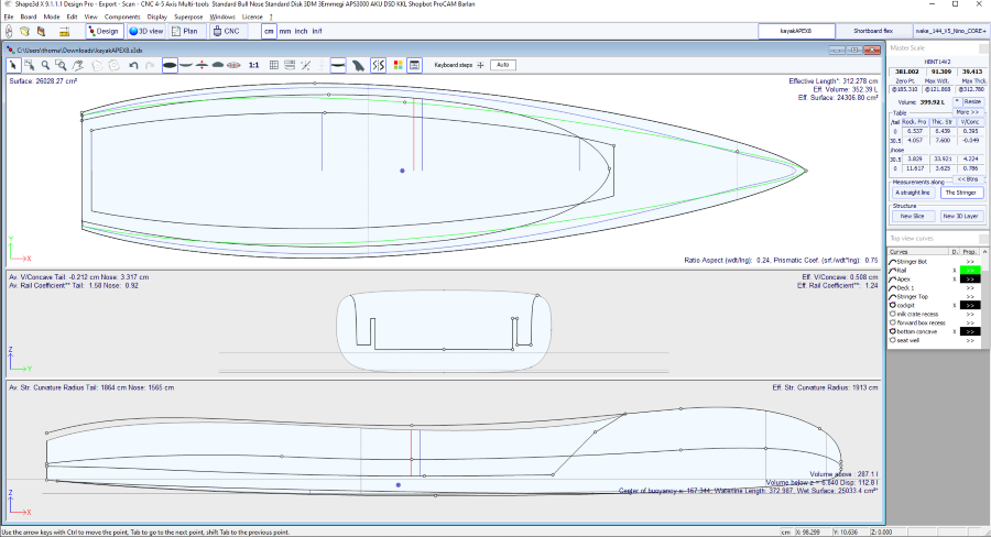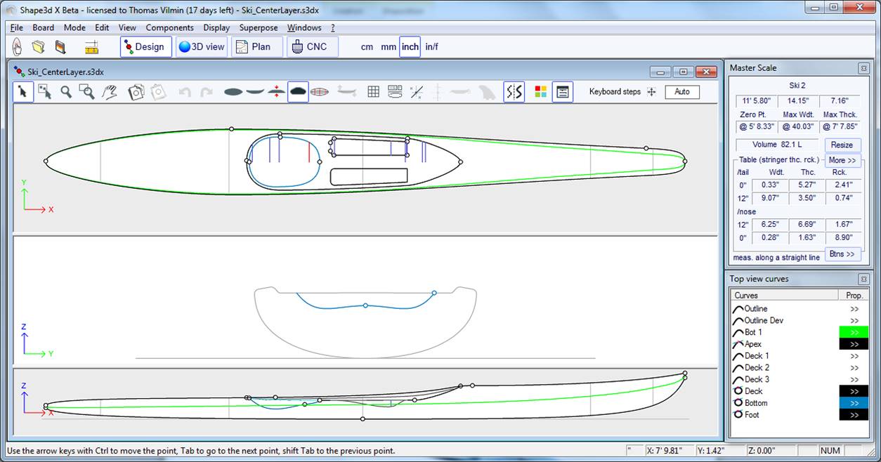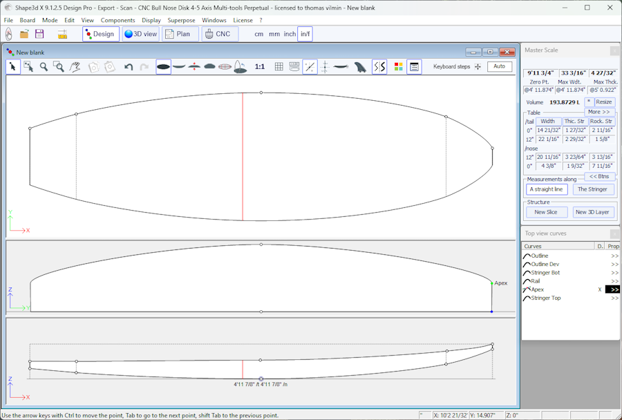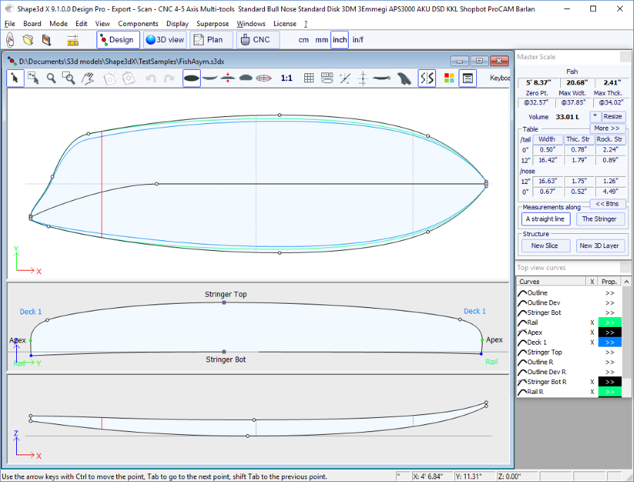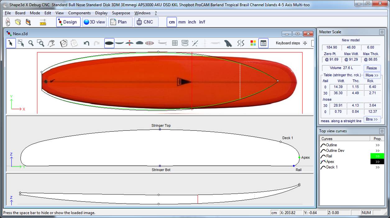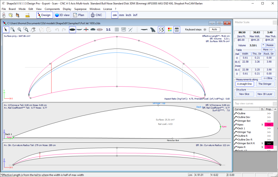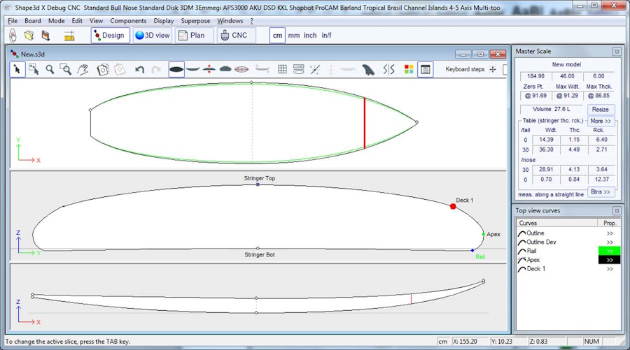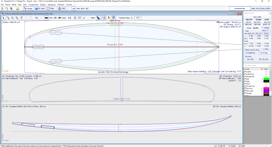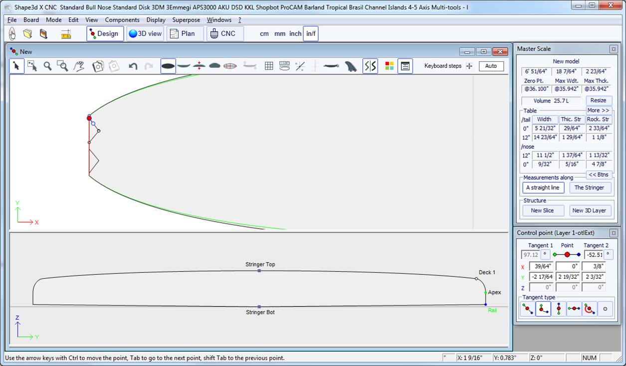 The Design Mode presents three 2D views of the boards that can be the outline, the profile, the thickness or the slices. In each view, the curves can be modified through the control points. The measures of the board are shown in the Master Scale box.