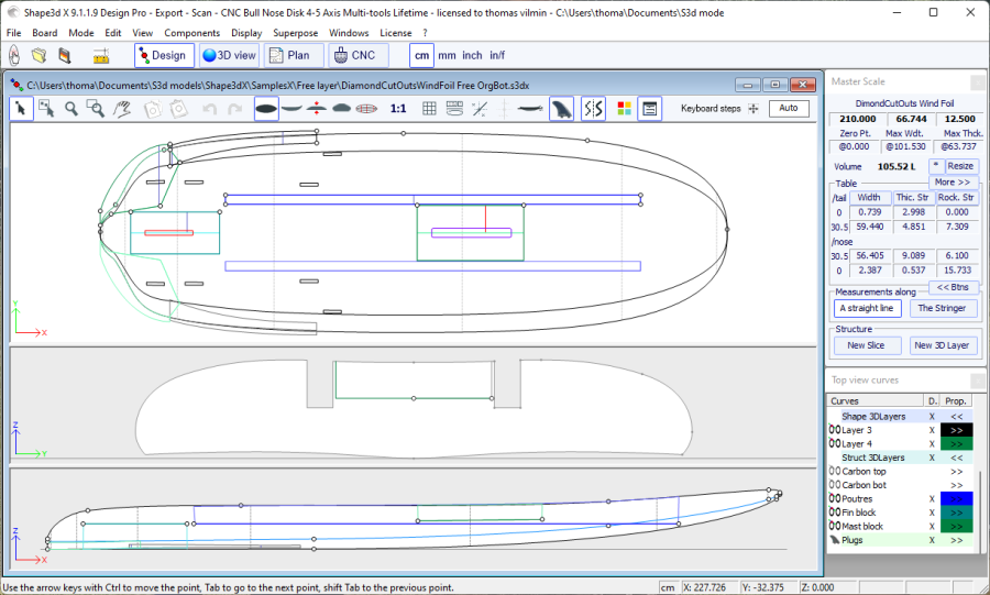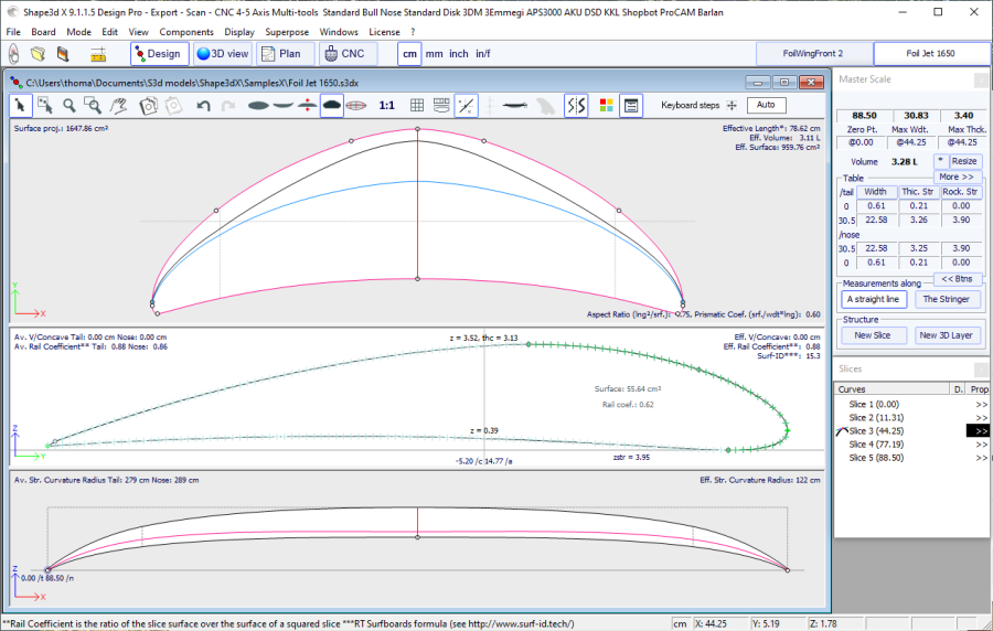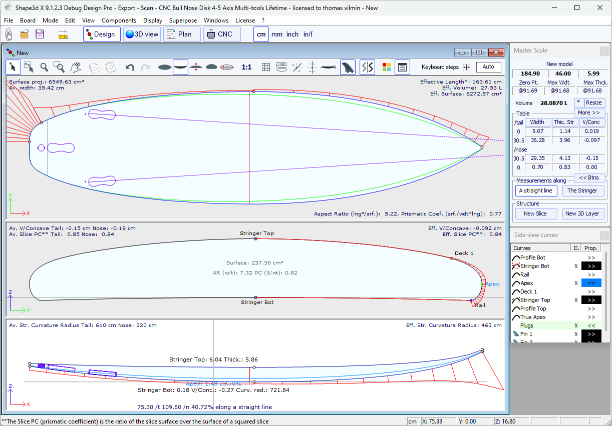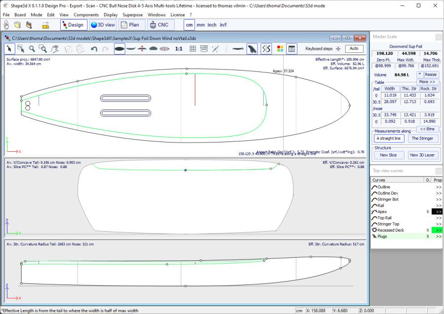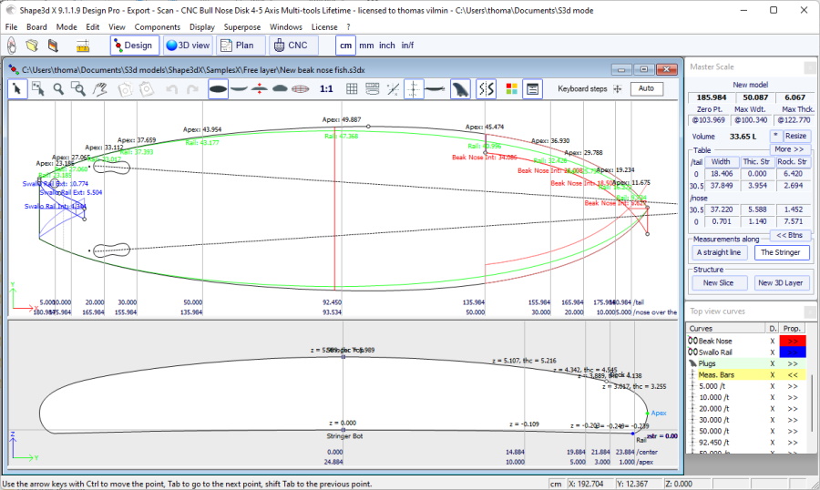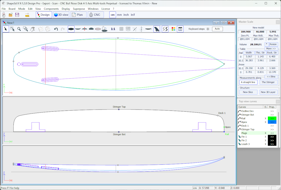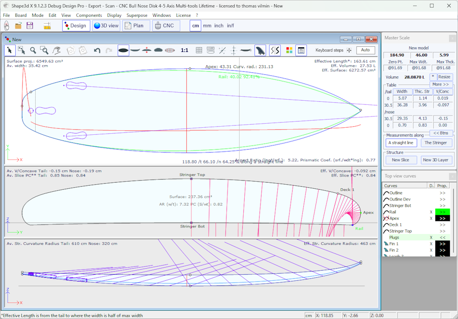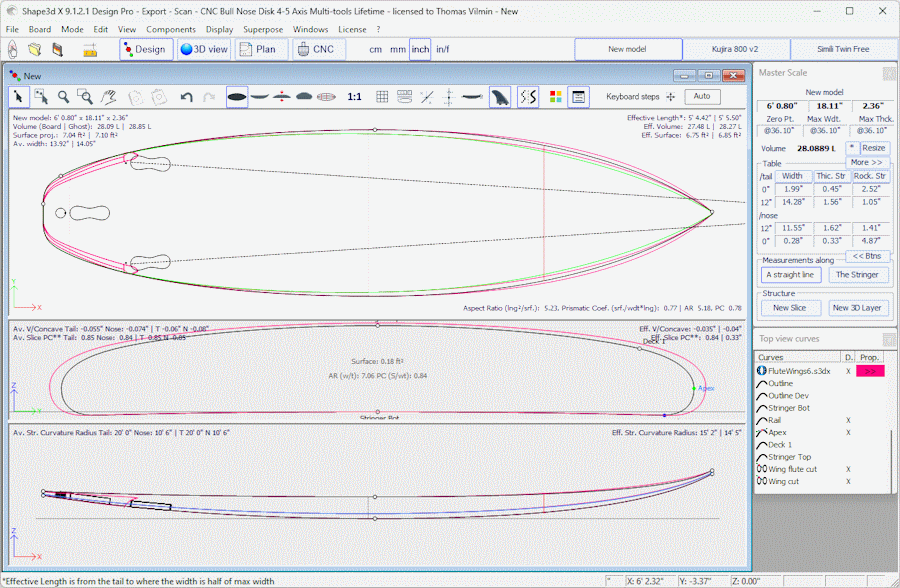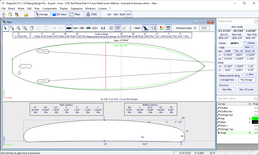 The Design Mode presents three 2D views of the boards that can be the outline, the profile, the thickness or the slices. In each view, the curves can be modified through the control points. The measures of the board are shown in the Master Scale box.