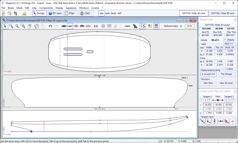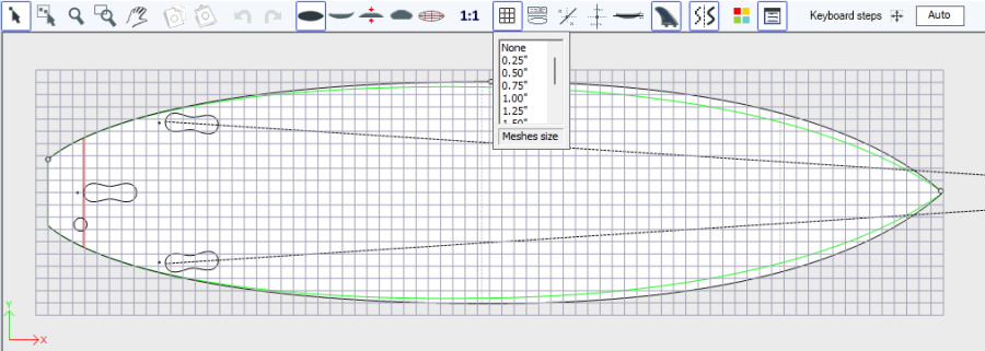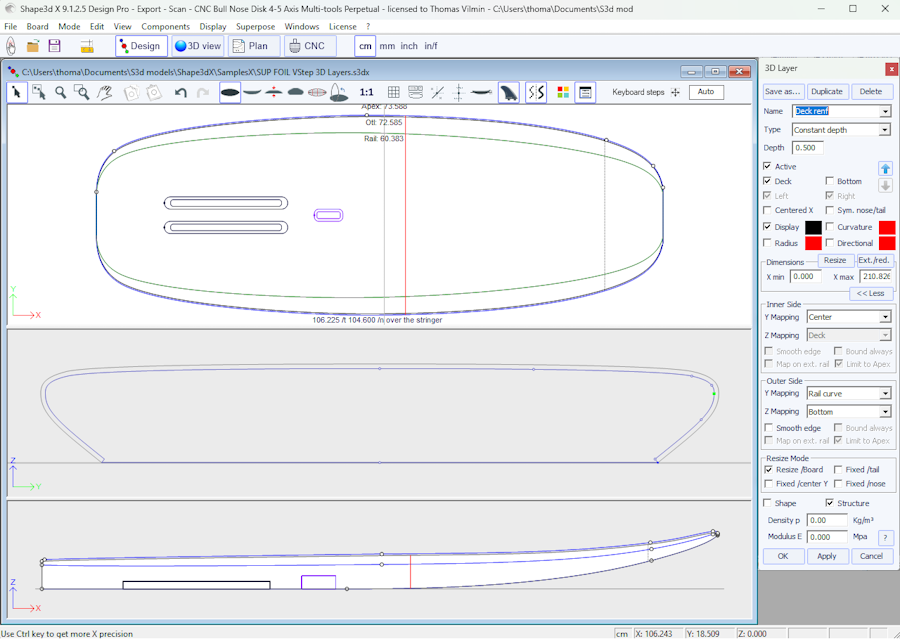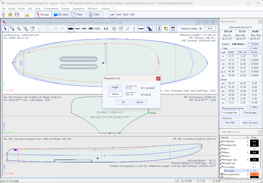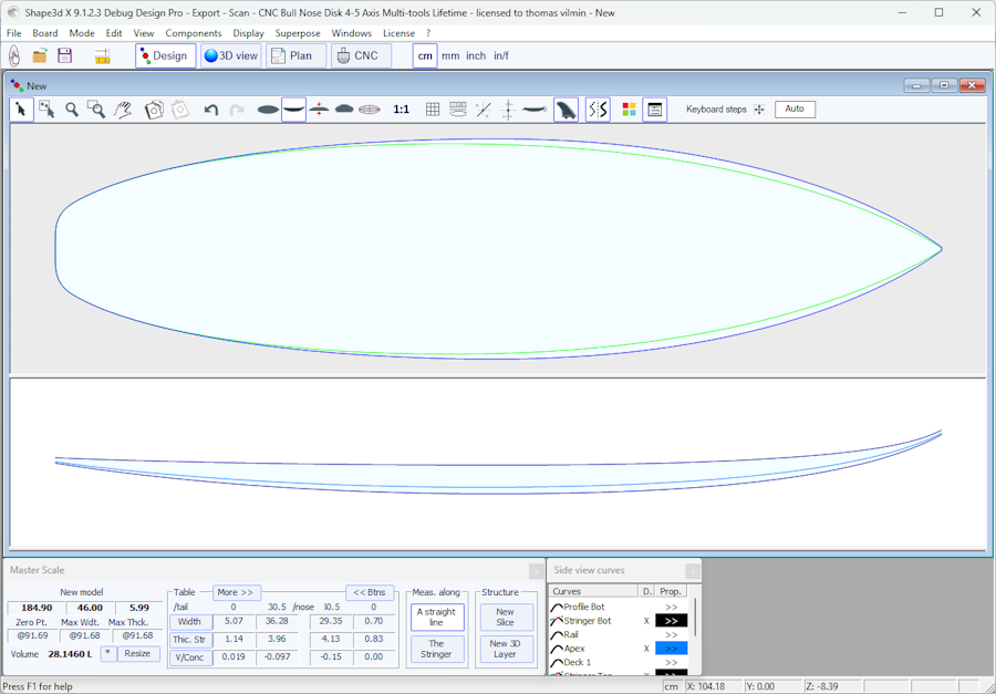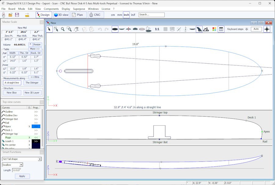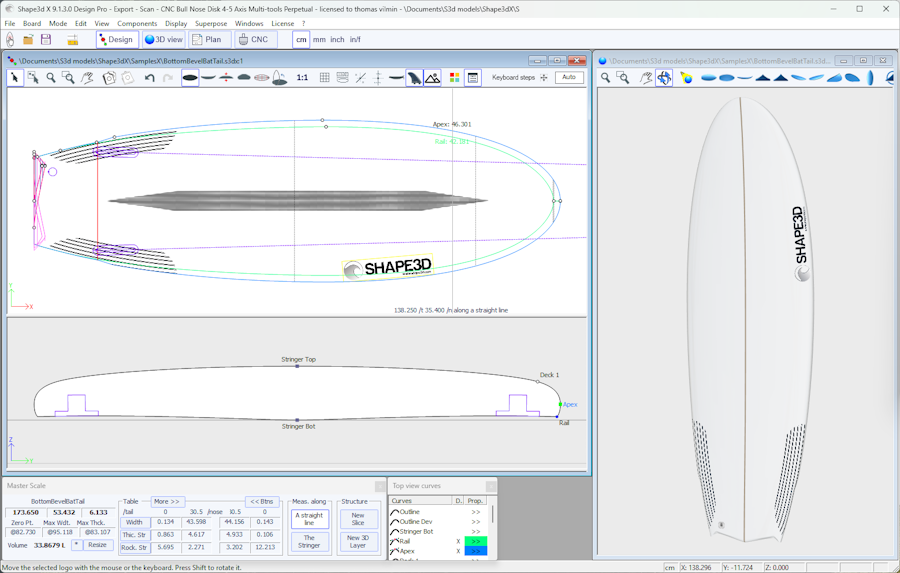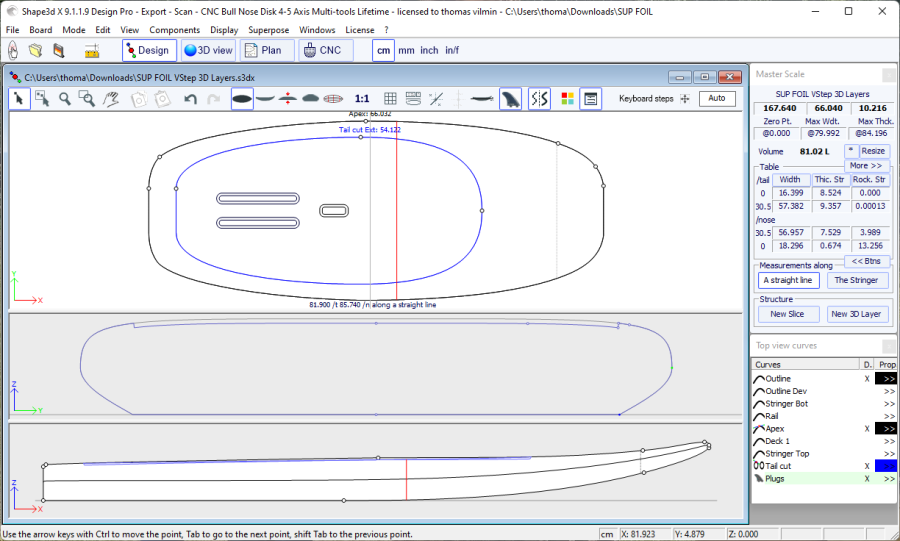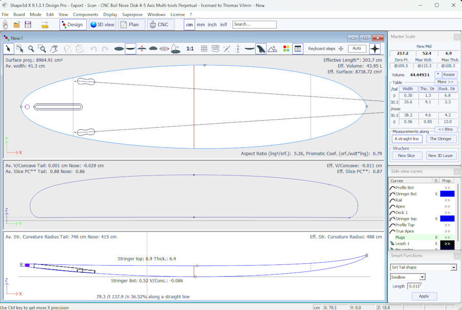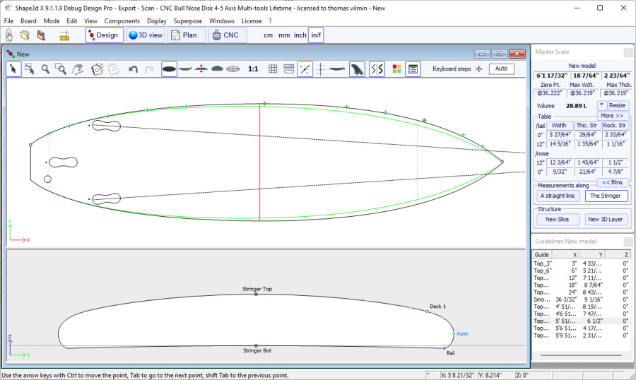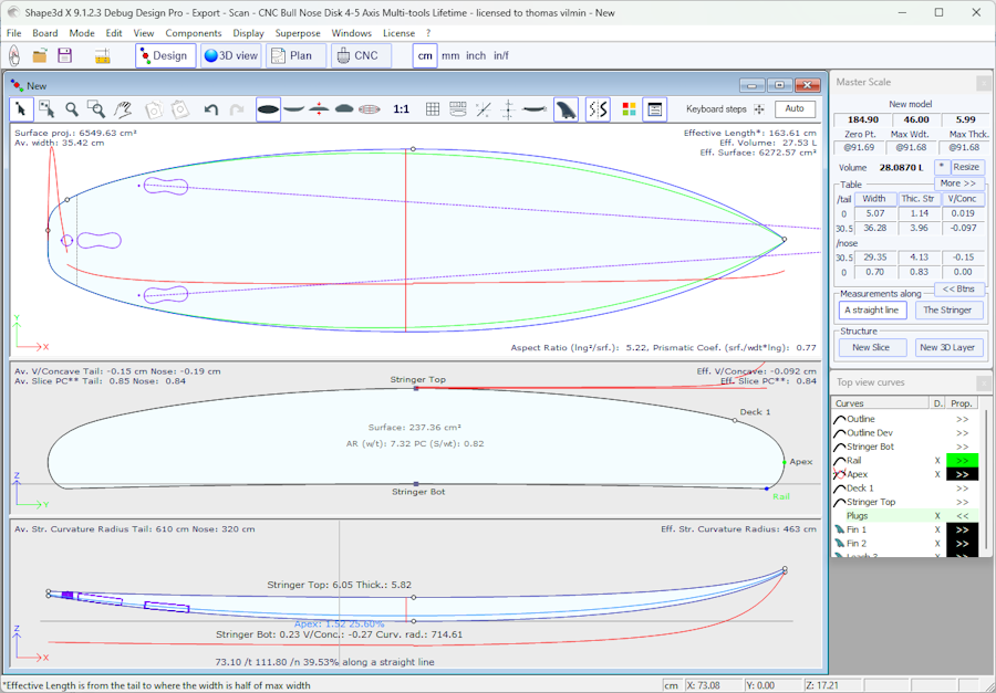 The Design Mode presents three 2D views of the boards that can be the outline, the profile, the thickness or the slices. In each view, the curves can be modified through the control points. The measures of the board are shown in the Master Scale box.