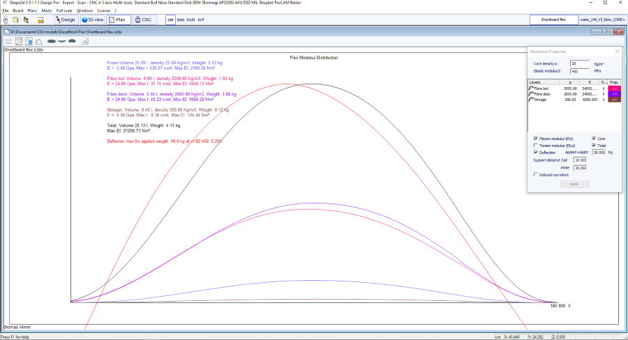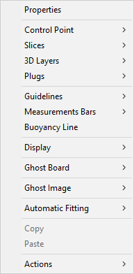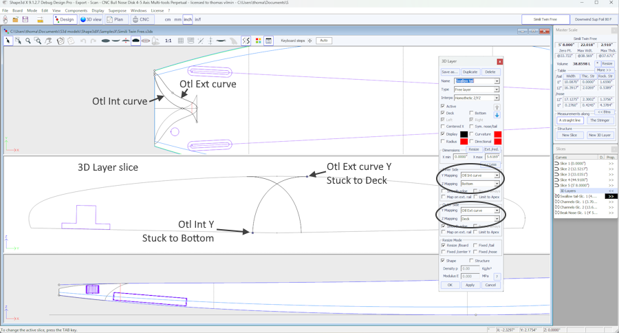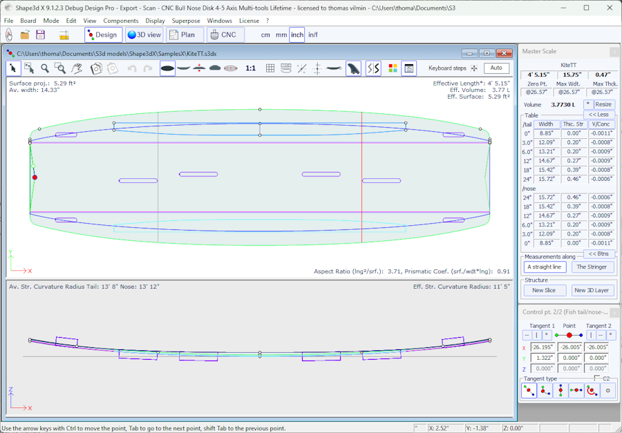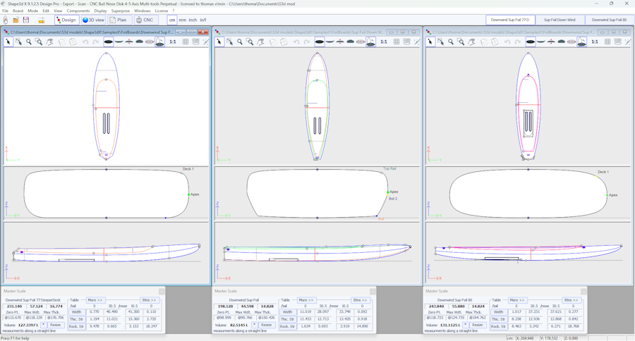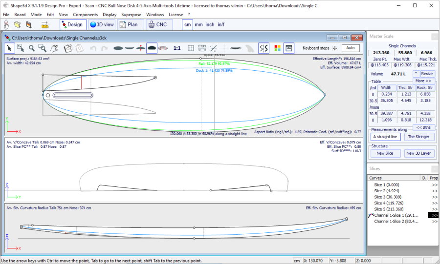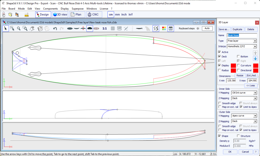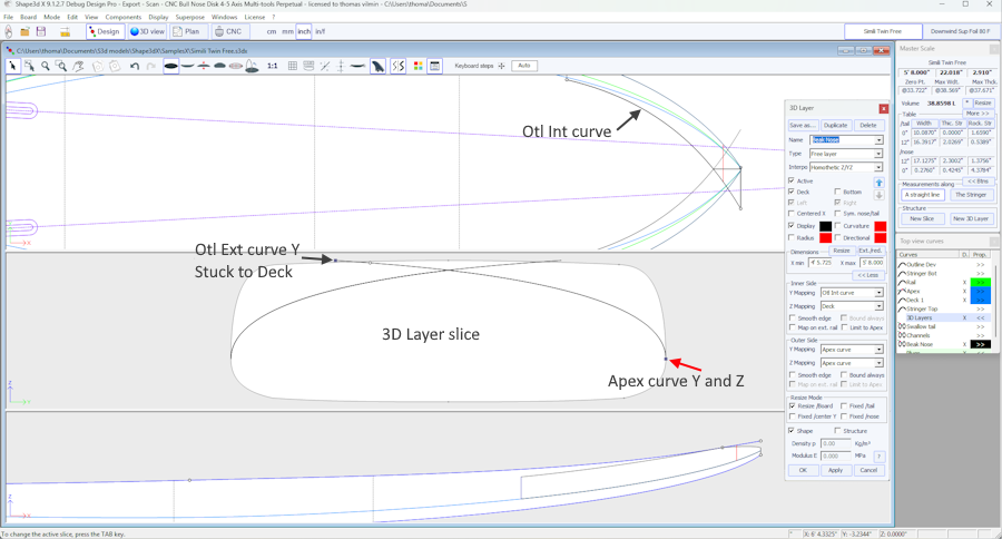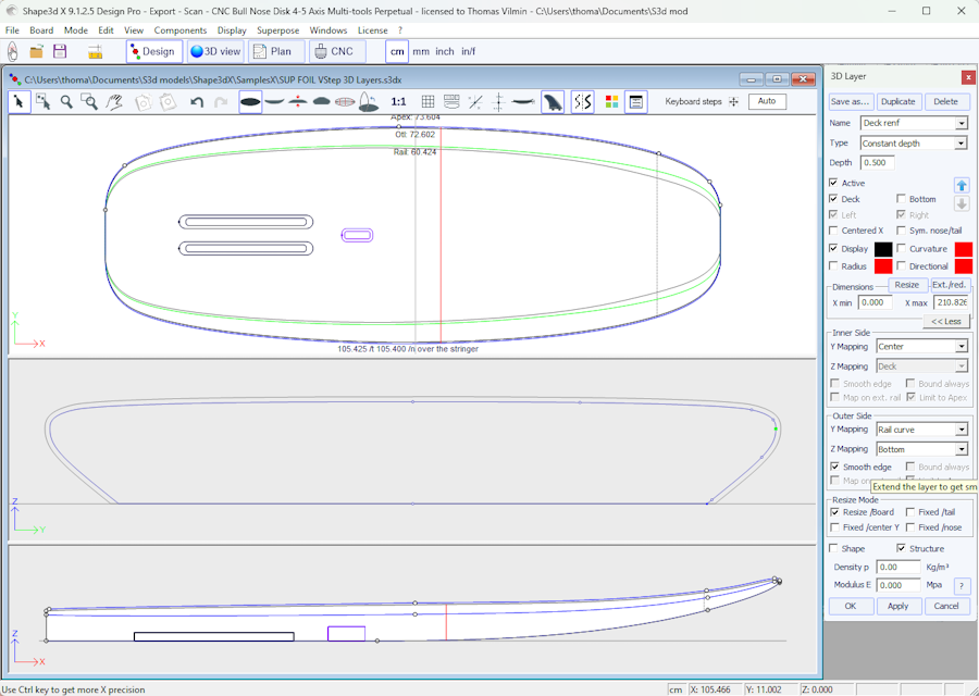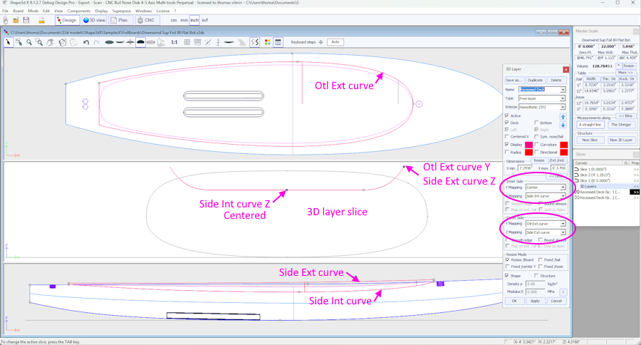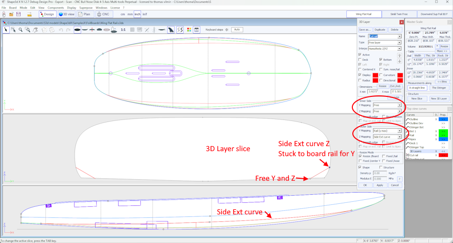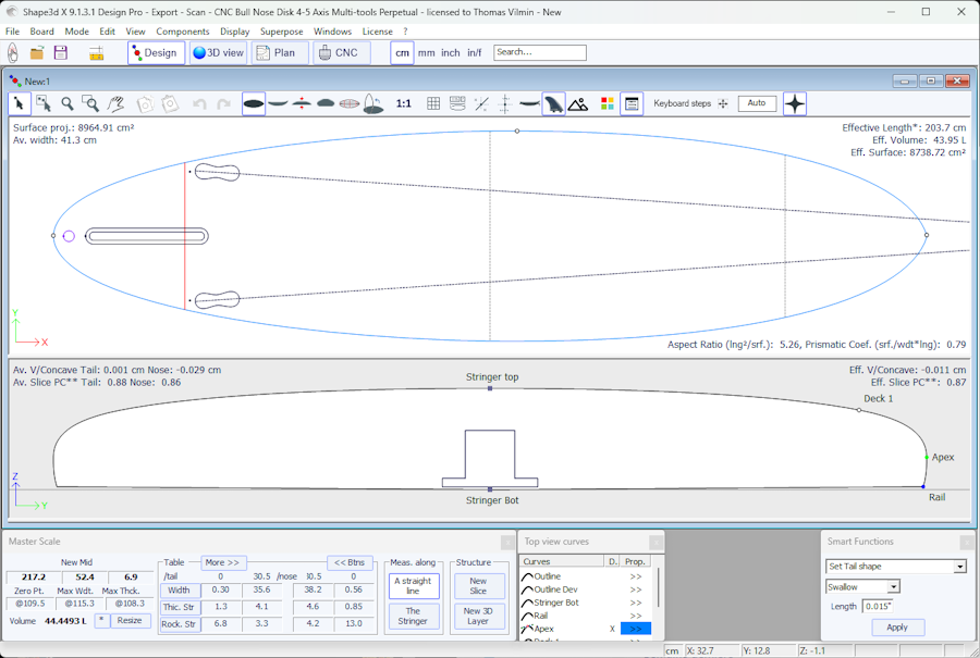 The Design Mode presents three 2D views of the boards that can be the outline, the profile, the thickness or the slices. In each view, the curves can be modified through the control points. The measures of the board are shown in the Master Scale box.