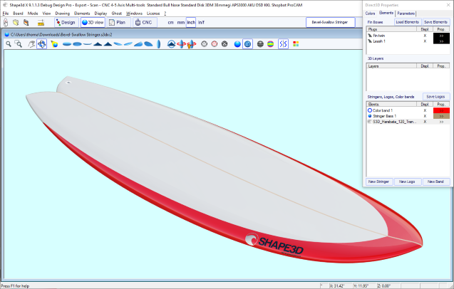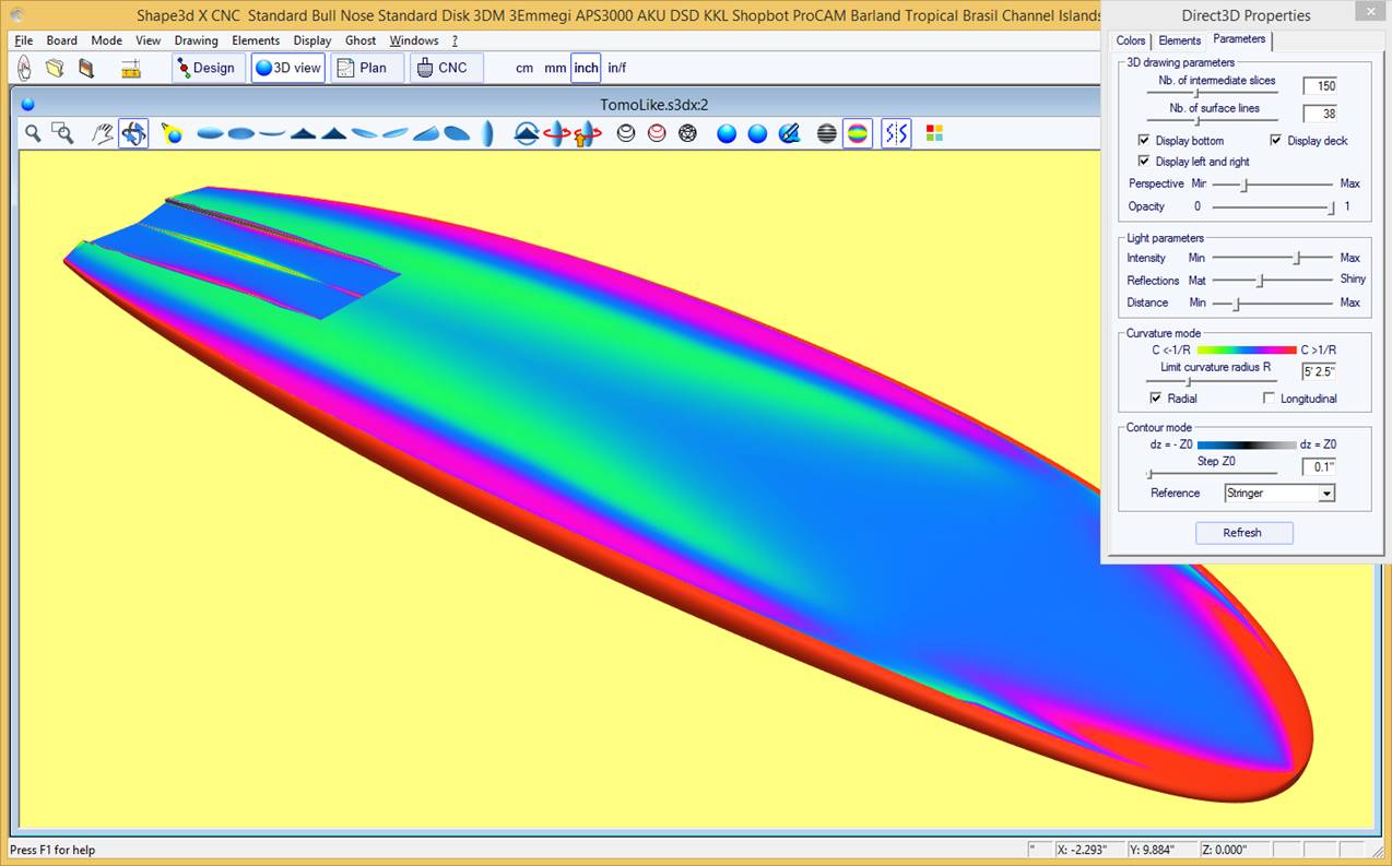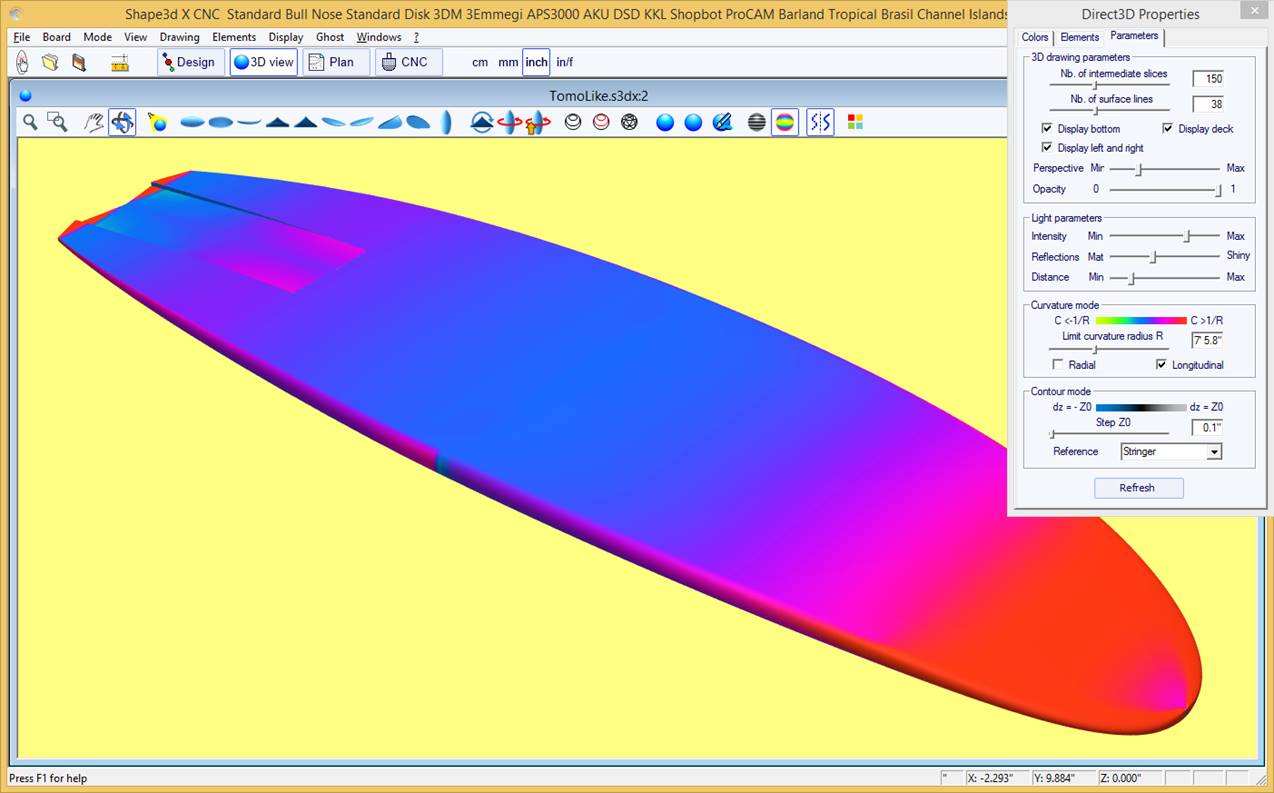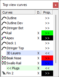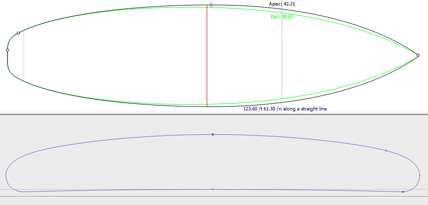- Stringer curve: the stringer on a surfboard is the piece of wood at the center that goes from the tail to the nose. It allows reinforcing the foam core and controlling the flex of the board. In Shape3d it corresponds to the center axis curves that define the rocker and the thickness of the board in the side view.