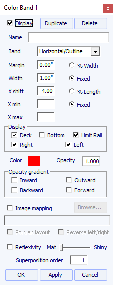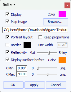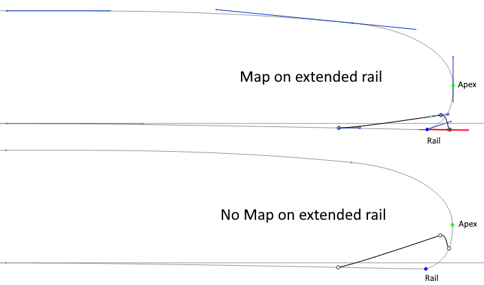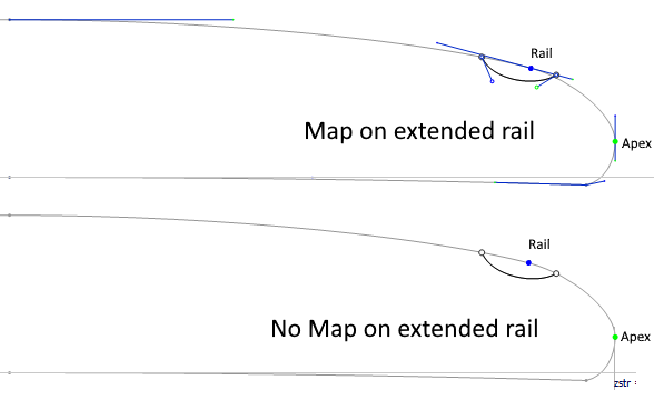 - Rail point: on the slices, you can also define a control point as Rail. It is usually the control point at the tuck of the bottom rail that you define as rail. You can also define a Rail point on the deck of the slices. It will be used if you add 3D layers with the option "Map on extended rail". It will also be used in the CNC mode to get a cleaner cut of the bottom tuck.