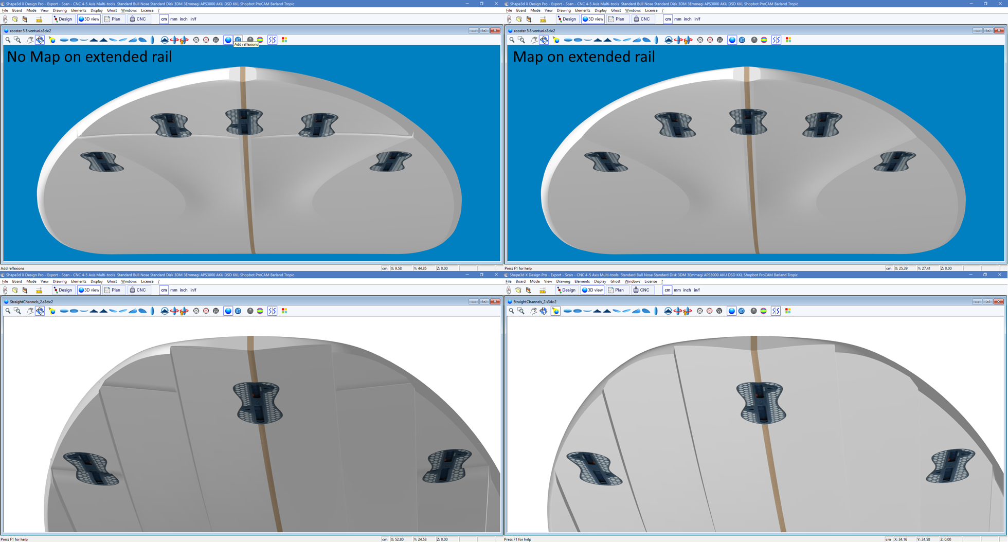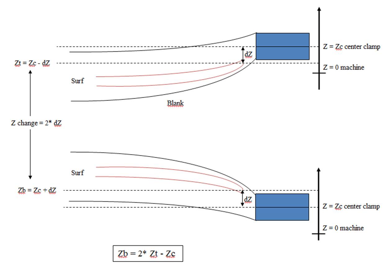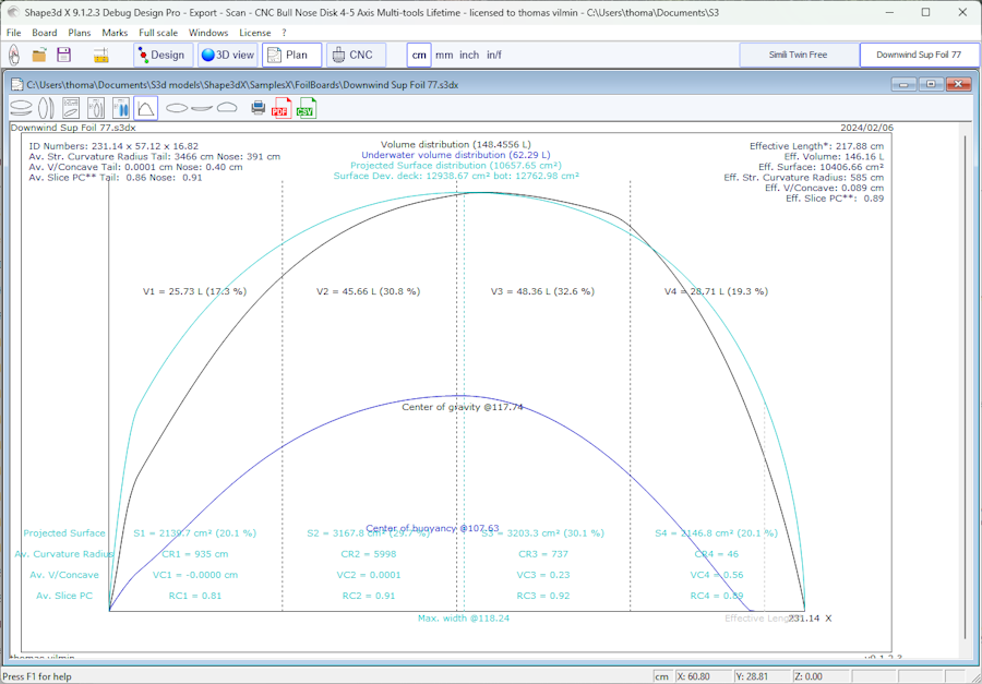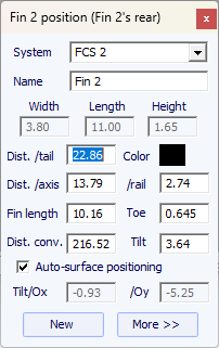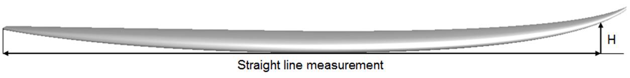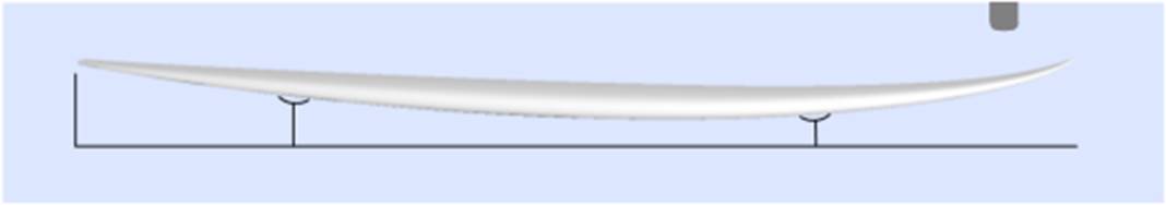 - V / Concave: the V/Concave describes the shape of the bottom of the board between the center and the Rail point. The bottom is concave when the center point is higher than the rail point. When the bottom has a V, then the center point is lower than the rail point. The bottom shape can be more complicated with double to multiple concaves. The measurement of the height difference (Z) between the center point of the bottom and the rail point is given as V/Concave in Shape3d. A V gives a positive value of V/Concave, while a concave gives a negative value.