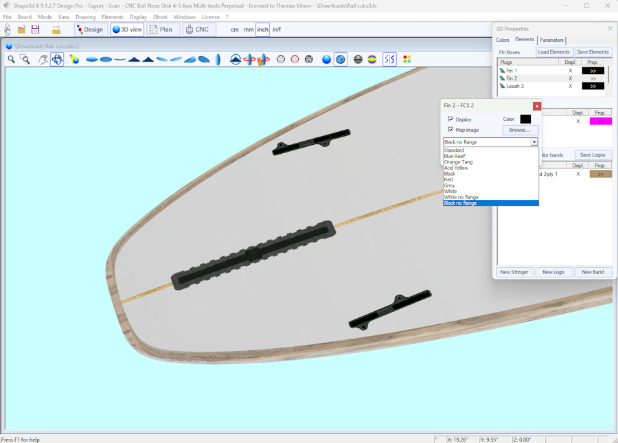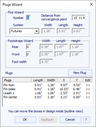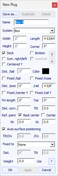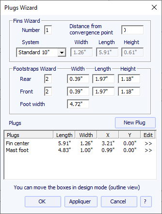 - Plugs: the plugs are elements that can be added on your design in Shape3d to render for the surfboard fin plugs, or leash plugs, or windsurf mast track or footstrap inserts, or any other rectangular or circular shape that should be added inside your design. The most common surfboard fin and leash plug brands are available in Shape3d (FCS, Futures Fin, Chinook...). You can also define your own custom plugs setting the dimensions and corner radius.