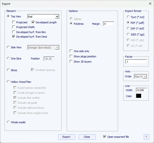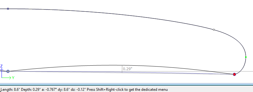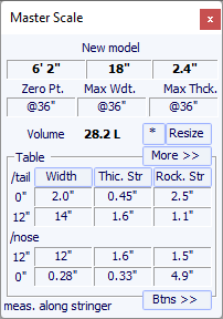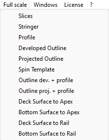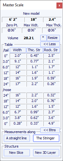 - Developped length / Measurement along the stringer: the developped length is the length measured from the tail to the nose along the bottom stringer curve. It is the length displayed when the button Measurement along the stringer is checked in the Master Scale Window. The Developped length is always larger than the Projected length.