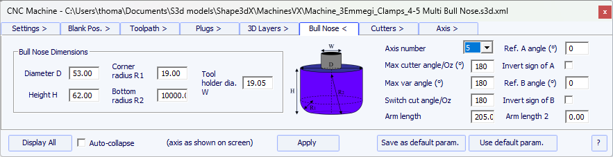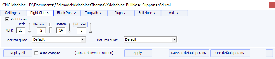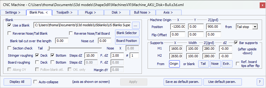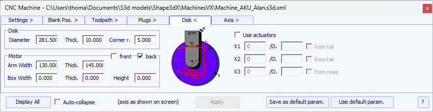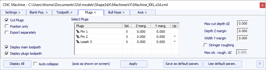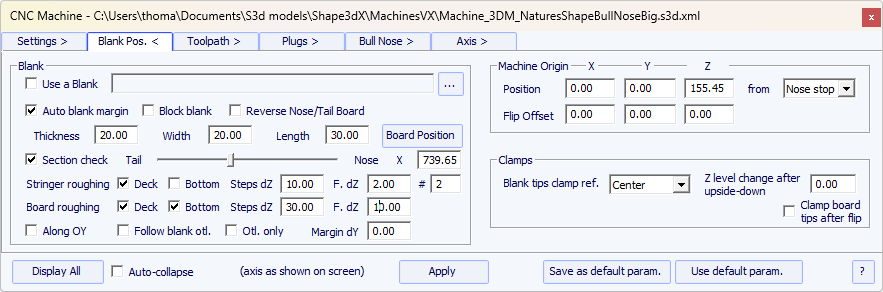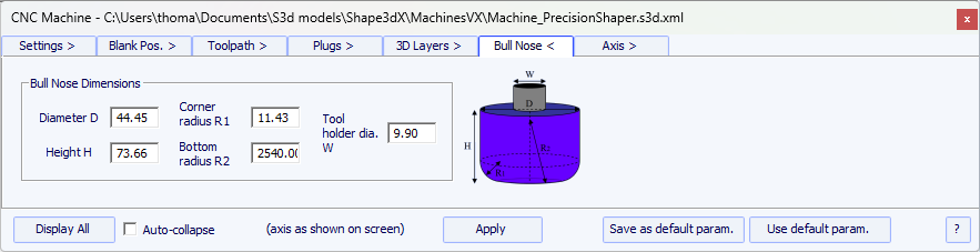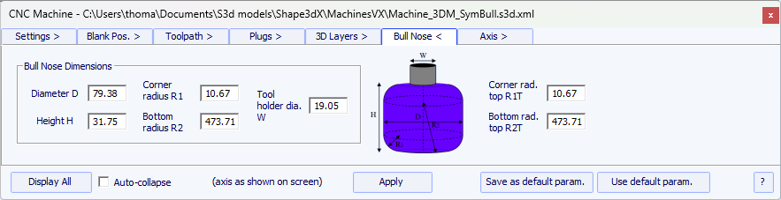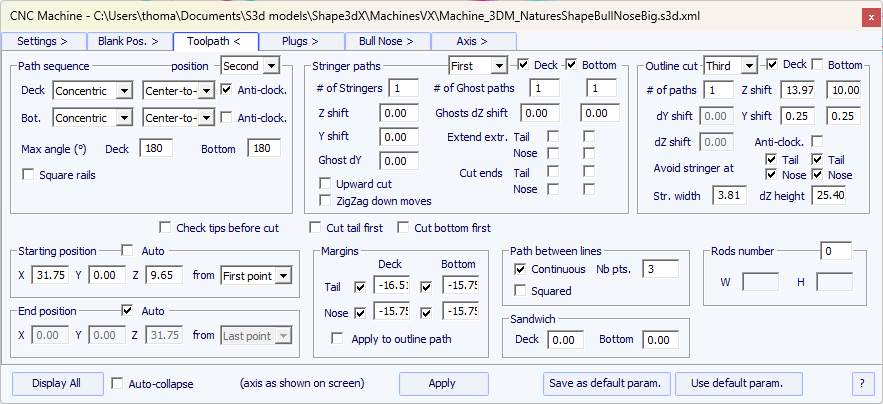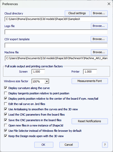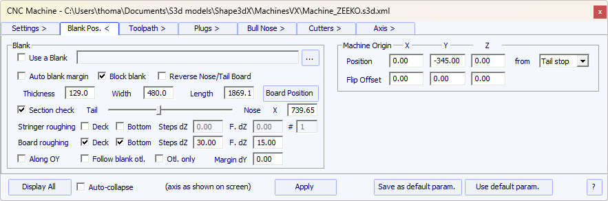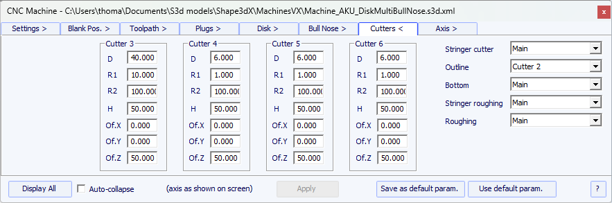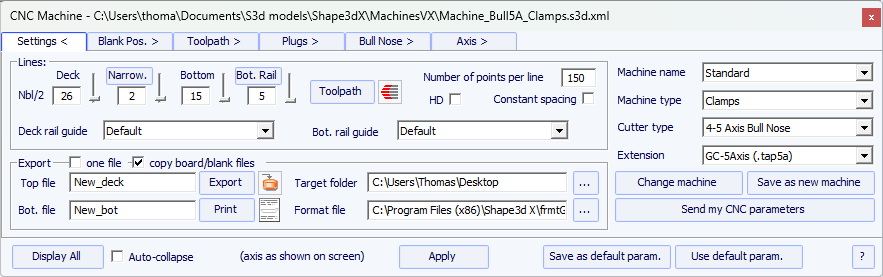- Machine file: the machine file is the file that contains the default settings used in the CNC mode of Shape3d.