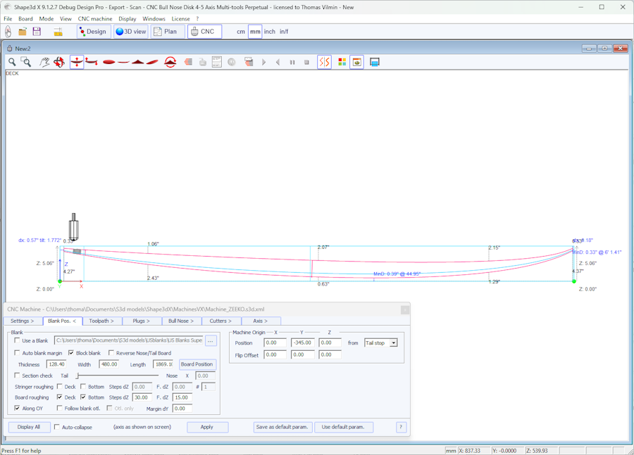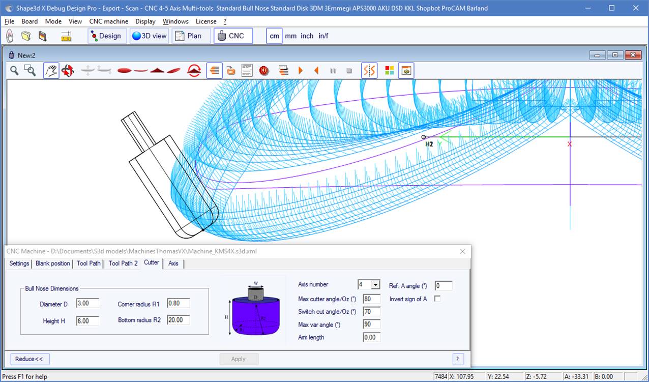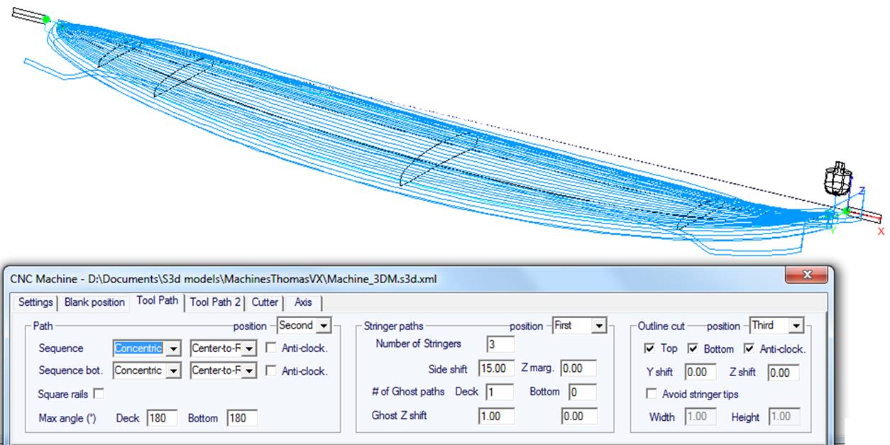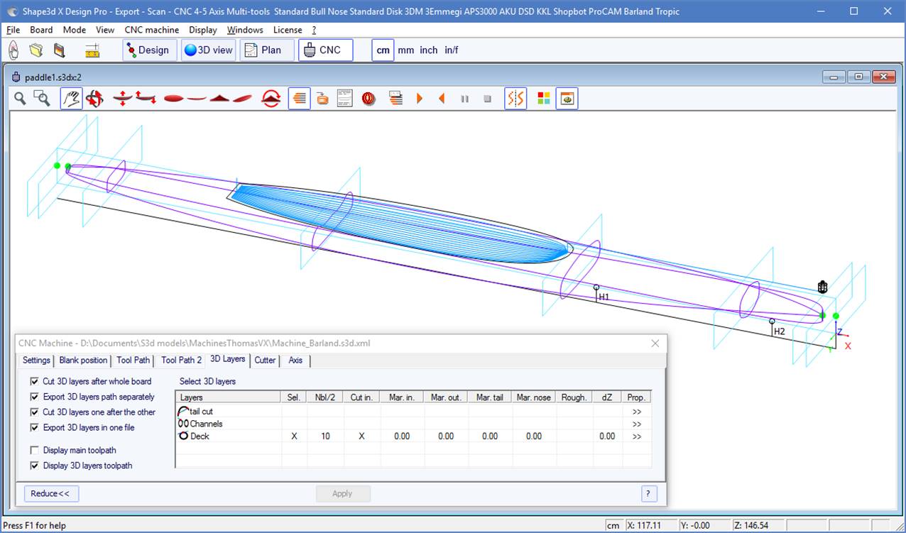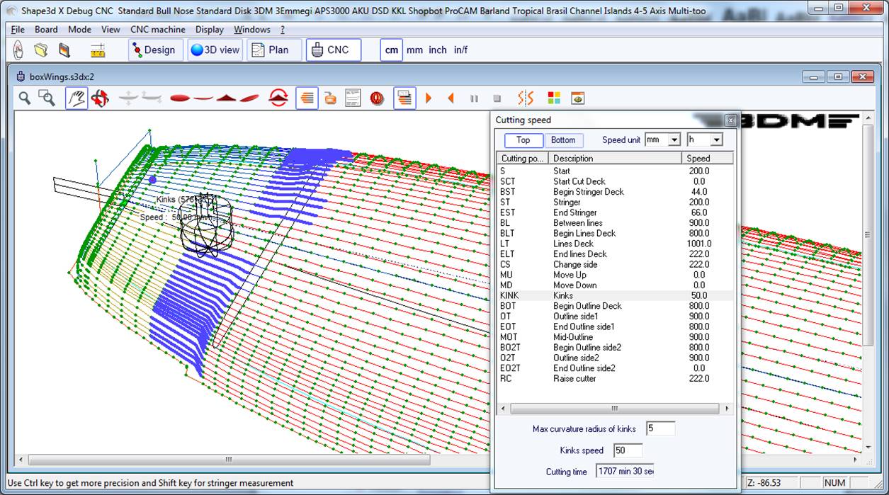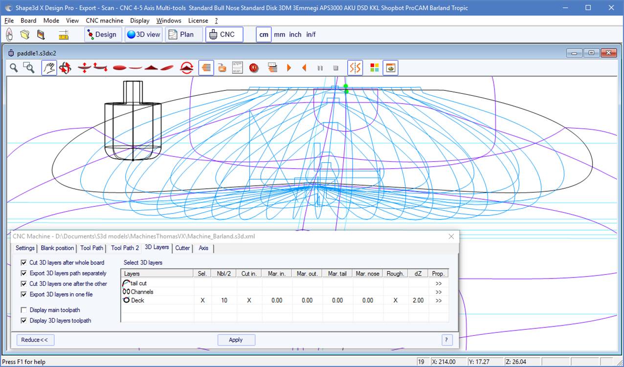 The CNC Mode presents all the settings of the CNC machine, and allows to compute, and visualize the cutting path.