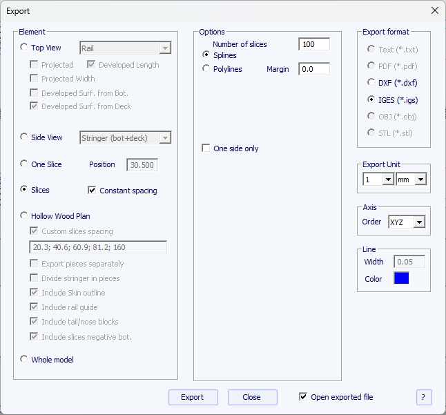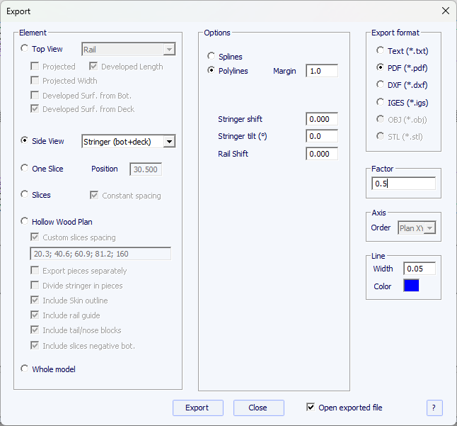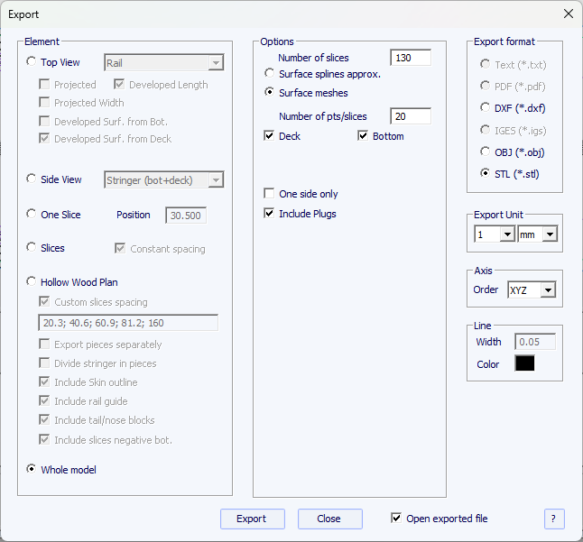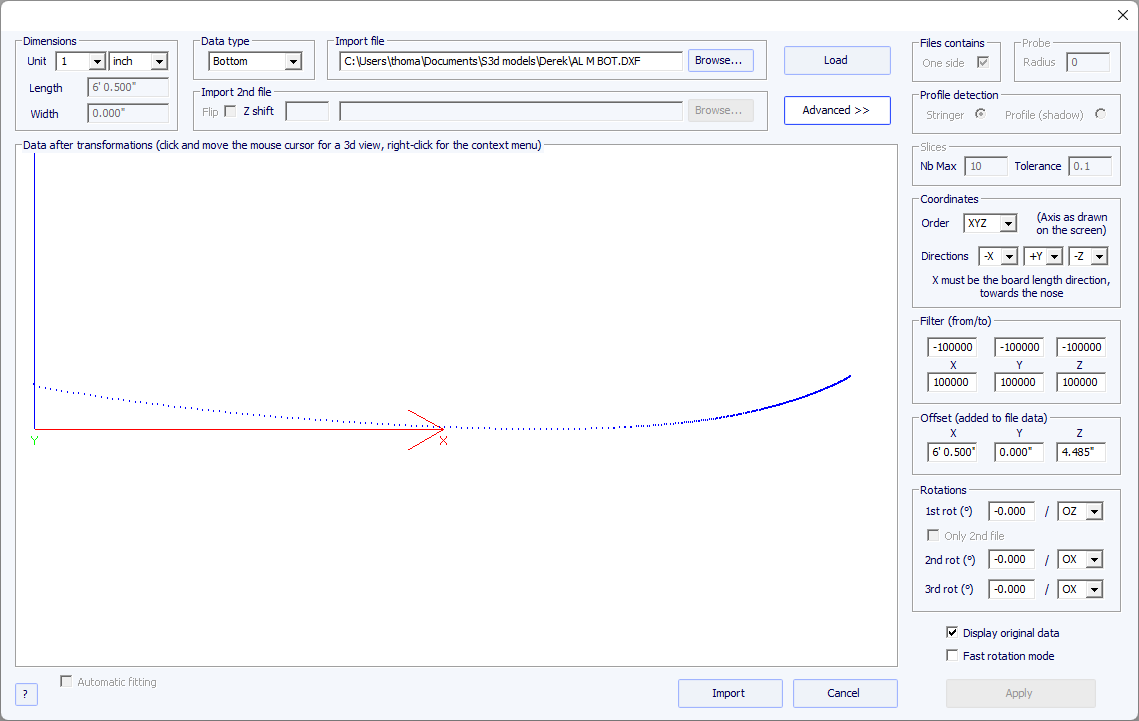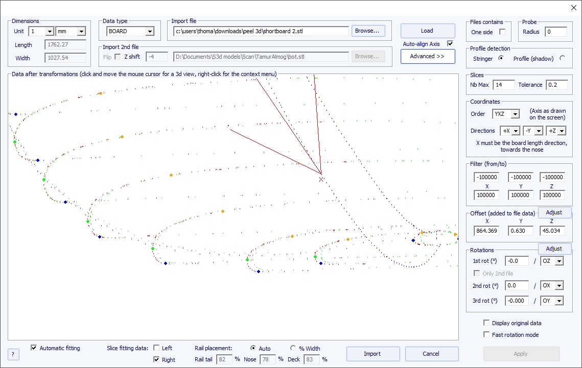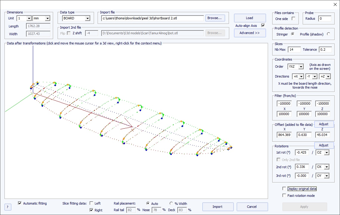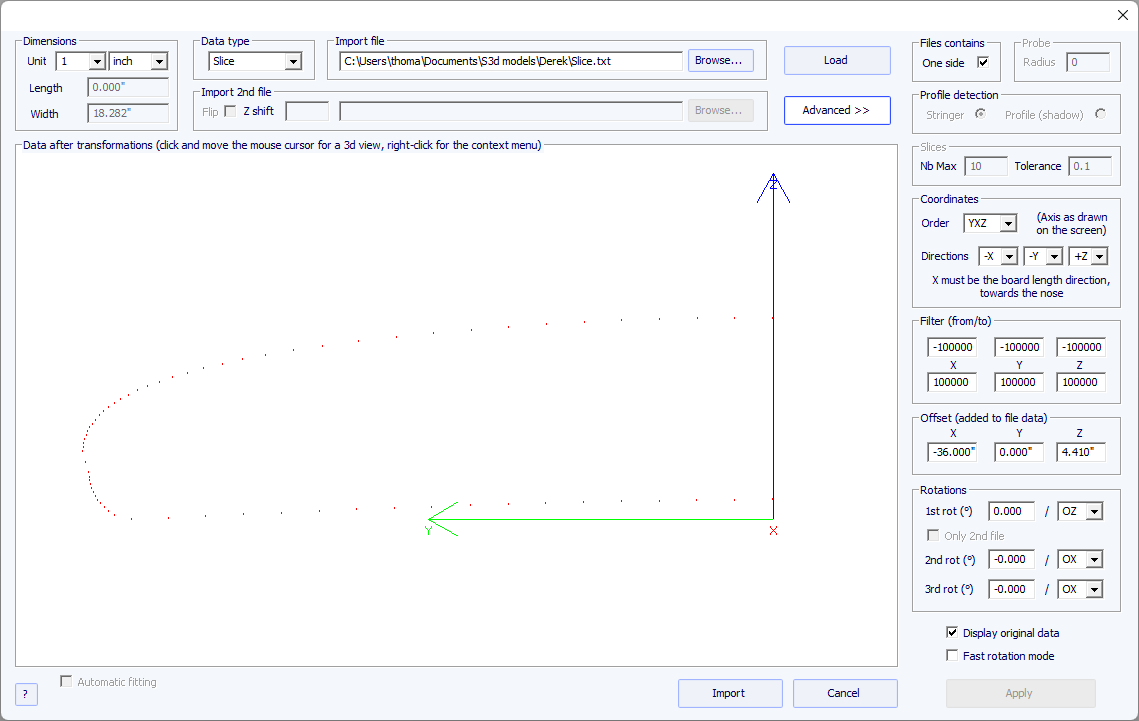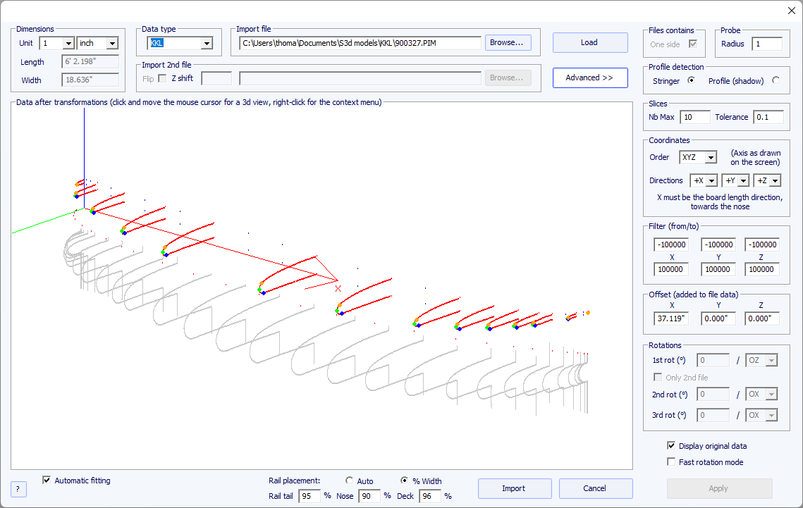 - If you want to import your data into a board that is in the "Stringer" design mode, check Profile detection: "Stringer". The software will then look for the stringer data around the X axis (with the tolerance fixed in the box Slices: "Tolerance"). On the other hand, if you want to import your data in a board that is in the design mode "Profile", check Profile, and the software will look for the lowest and highest points of each slice to create the profile.