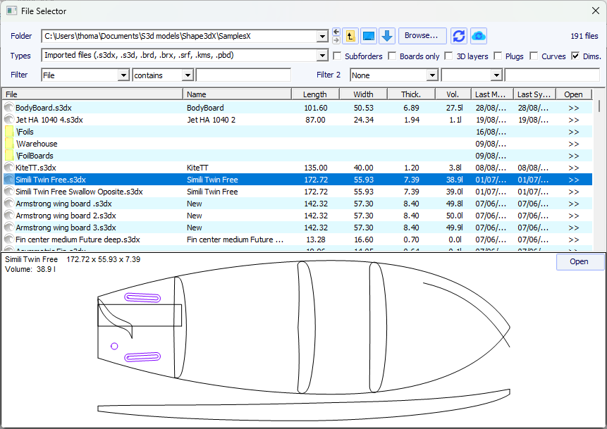 - The new model will start from a default file. You can define a different default file for each Category/Type of design (Surfboard/Shortboard, Longboard, Windsurf...). The default file when you install Shape3d is New.s3dx. Don't hesitate to change it to one of your own files!