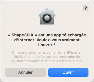 The first time you'll be asked if you realy want to open Shape3d X as it is a downloaded application. Click Open.