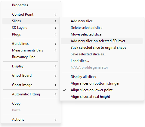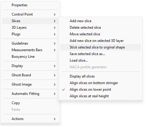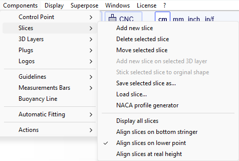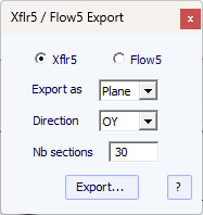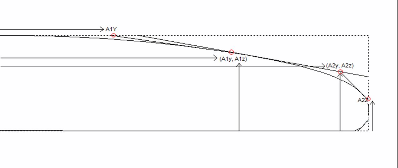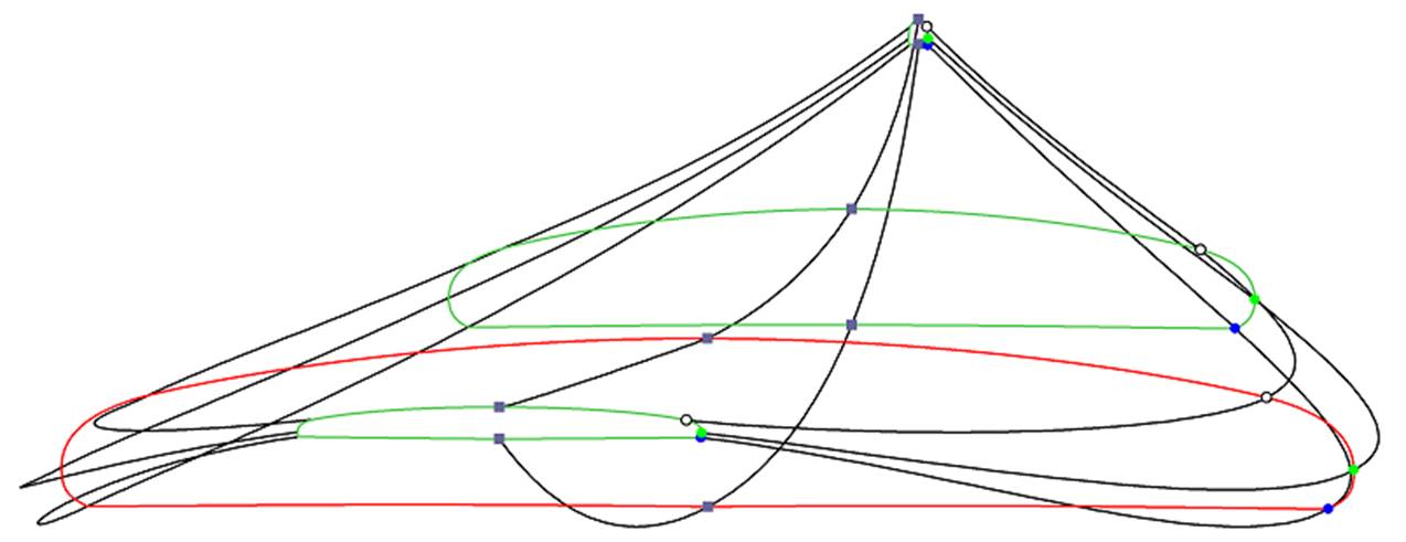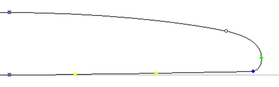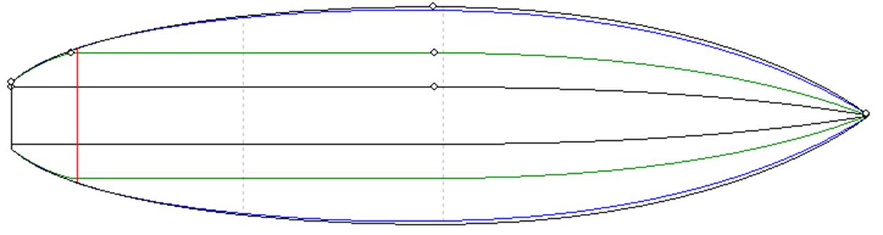 - Slice: the slices are curves that define the cross sections (plan OYZ) of the design at given positions along the length (OX axis). They are edited. You can instert as many slices as you want. The minimum number is 2 as there are always one slice at the tail X=0 and one at the nose X=length. The slices can have as many control points as you want, but all slices always have the same number of control points. These control points will initiate the curves that define the skeleton of the design.
