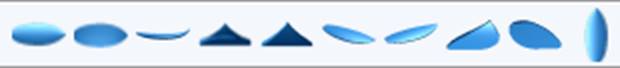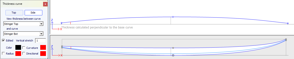 - Thickness curve: the Thickness view of the Design mode allows displaying the distance between two curves. This distance is taken prependicularly to the first curve, except if the slope is too strong, the distance is taken verticaly then. When an edited curve is "fixed to" another edited curve, the Tickness curve between these 2 curves can be edited as well: you can modify it using control points.